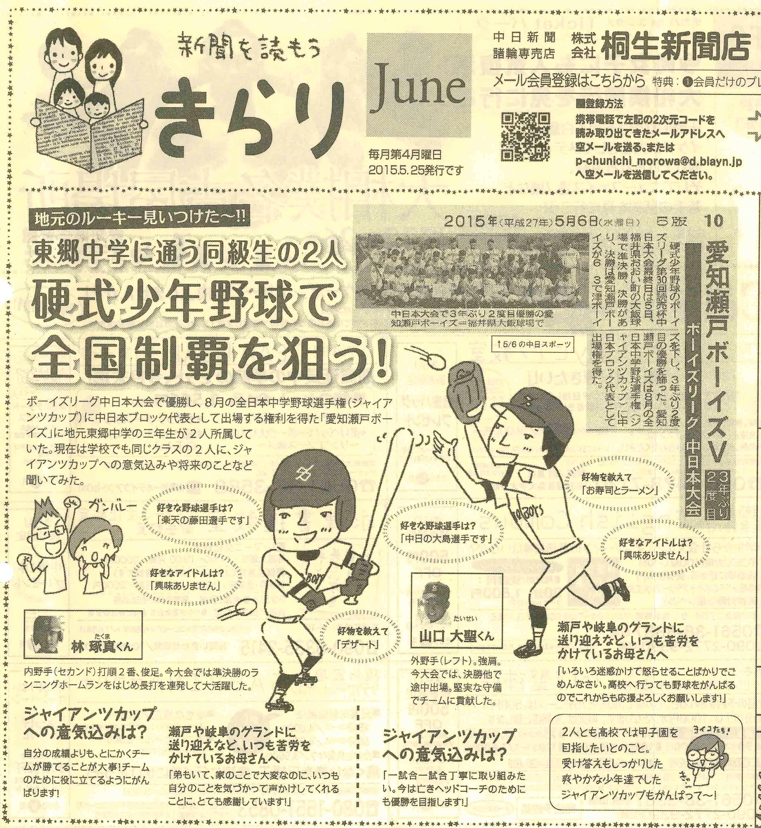 6月6日付の中日ホームニュースに、「全日本中学野球選手権大会(ジャイアンツカップ)」に出場し全国制覇を目指す東郷中学3年生の男の子2人が紹介されていました。