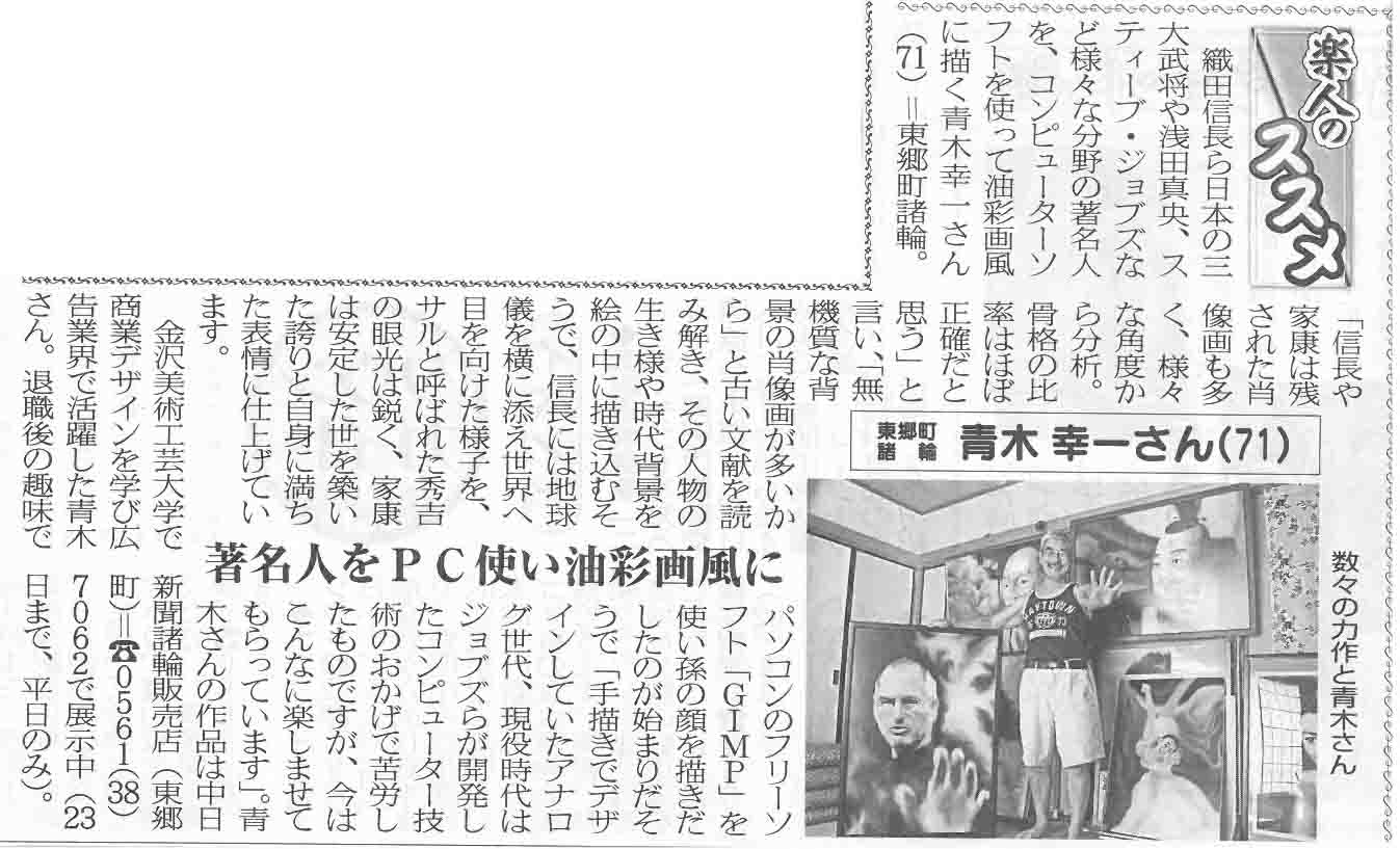 2017年8月19日(土)付の中日ホームニュースに、青木さんの記事が掲載されました!!23日(水)まで当店にて展示中ですので、ぜひお越し下さいね♬