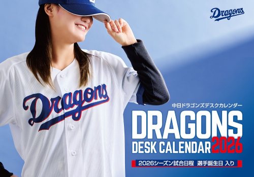 2026年試合日程、選手誕生日が入ったスケジュールが書き込めるページと、ドラゴンズ選手のベストショットで構成されたリバーシブルで使用できる卓上タイプのカレンダーです。